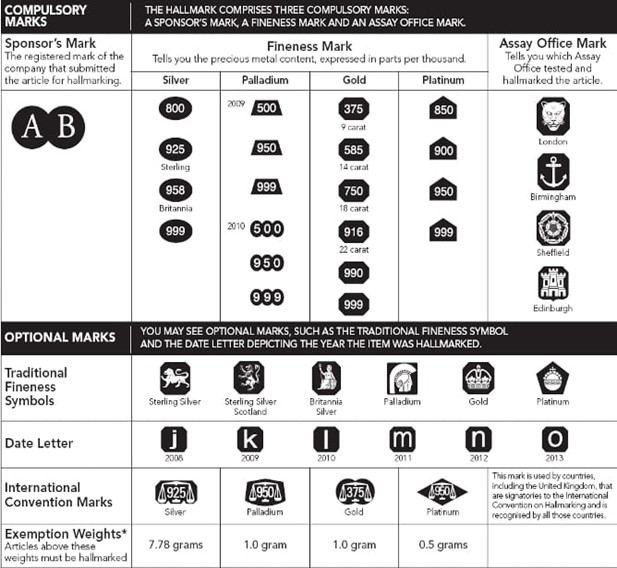 A hallmark is an official mark or stamp on gold, silver, platinum and palladium products in order to attest the purity of a stamp bearing object. Hallmarks are also known as assay or standardized markings legally mandated by the district in which the item was manufactured. Hallmarks can be considered as distinguishing characteristics that are usually stamped on gold, silver, palladium and platinum items so to identify the articles purity or karat. Other hallmarks are added so that customers and businesses can easily identify its manufacturer or designer. You will find hallmarks in a variety of places. Typically, hallmarks are located on the inside of a ring or the tag near the clasp of a bracelet or necklace. Often hallmarks are quite small, or get worn off due to wear or damage, thus you may need to use a magnifying glass to clearly see the hallmark. If you are unsure of the hallmark or you are unable to find one, bring the item into Toronto Metal Exchange – we will be able to establish the purity within a few minutes using a couple of simple tests.