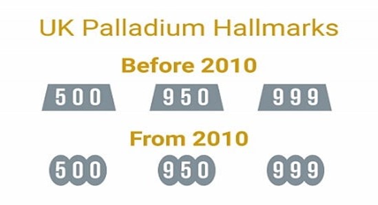 Palladium hallmarks are a relatively new addition to precious metal hallmarks. Palladium experienced a surge in demand in the past couple of decades, with prices rising accordingly. While platinum is still the primary metal of choice for jewellery, palladium is increasingly being used as well.